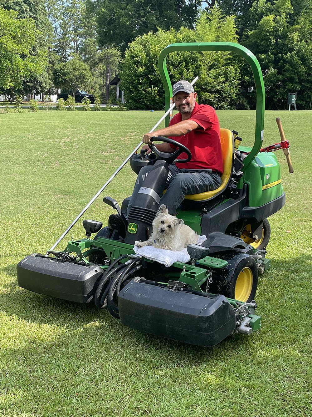 Ever since, Chloe has not left Copeland’s side – literally. Despite her diminutive stature, Chloe rides with Copeland everywhere – on a mower or spray rig, and in his utility vehicle. And when Chloe isn’t riding, she’s usually on the course somewhere greeting golfers.