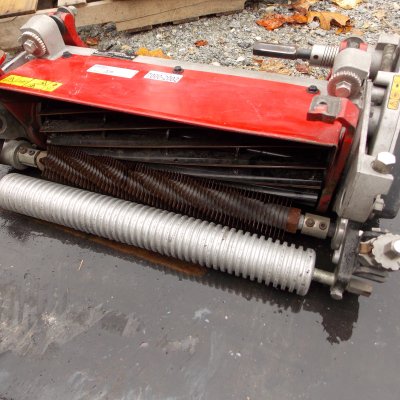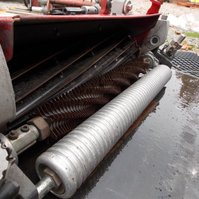 SPRING STEEL Spiral rotating blades used to thin grass before cutting.