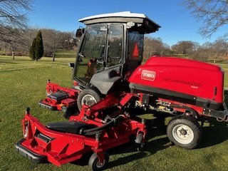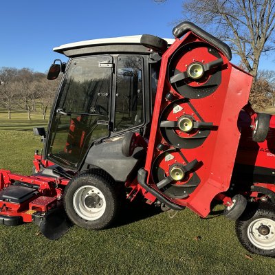 The cutting units have been completely refurbished from top to bottom. The right, left & center decks had every part removed then sand blasted and powder coated. The right and left winglets on the center deck are brand new. All decks have new parts including chambers, pulleys, belts, belt tensioners, pivot arm idler shafts and Idlers, anti-scalp rollers, roller shafts and hardware