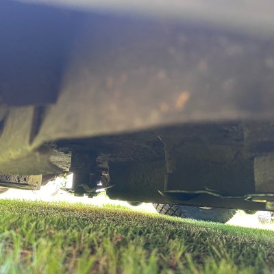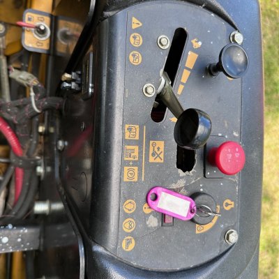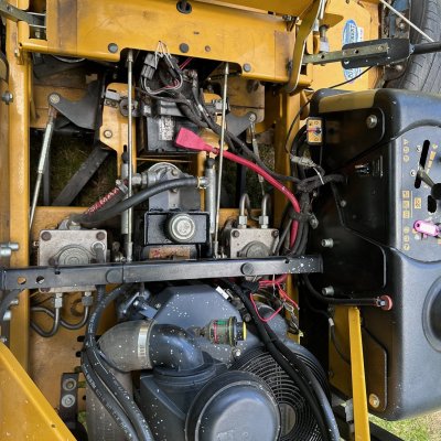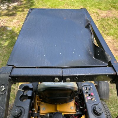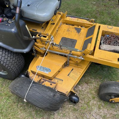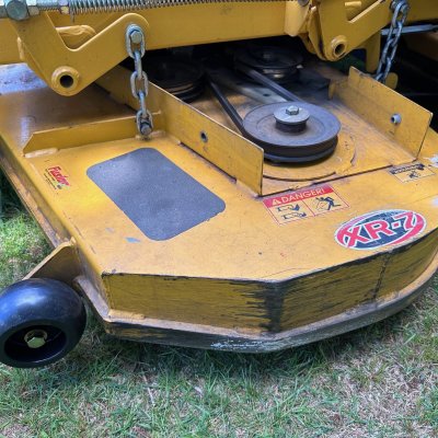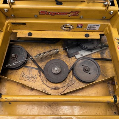 Missing one deck belt guard, and the rubber shield was obviously replaced with a "mulching tire".