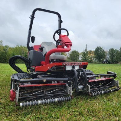 The Toro Reelmaster 3100-D Sidewinder is a fairway mower known for its precision and maneuverability, especially around obstacles. It features a Sidewinder cutting unit that can shift laterally, a Kubota 21.5 hp diesel engine, and a 3-wheel drive system for traction. 72" cut.
