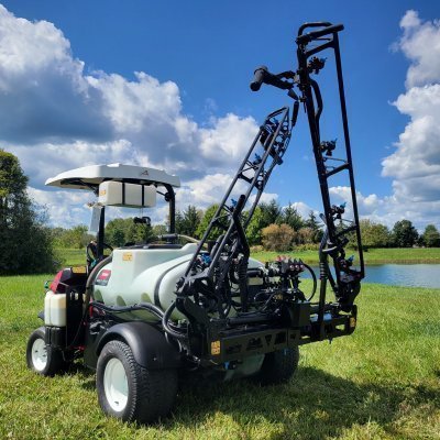 The 2018 Toro Multi Pro® 1750 is a 175-gallon turf sprayer equipped with a Kohler CH740 Command Series engine, a Hardi 364/5.5 six-diaphragm spray pump, three side-mounted agitation nozzles, a 18.5 ft triangular spray boom, and a QuickFind™ control console. It features hydraulic disc brakes, a double A-arm front suspension with a rigid rear, a fully hydraulic steering system, and a hill-assist feature for stable operation on inclines.