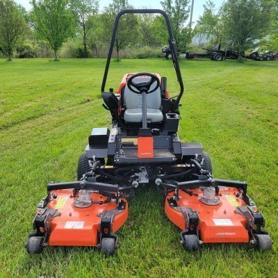 3 deck rotary with side shifting technology. Similar to Toro 3500 Sidewinder or John Deere 7400. Kubota 24.8 hp diesel. Equipped with a 72 inch deck with 12 inch side shift capability. HOC from 3/4 to 3.5 inches. NEW air cleaner. Rear hood cracked and bruised as shown below. (For an additional $2,000 we can have a new one installed. But if you're looking for a mower that cuts and doesn't have to be pretty, this is for you.) Left drive tire shows some wear on the side. Comes with NEW blades upon purchase! Several NEW front rollers installed.
